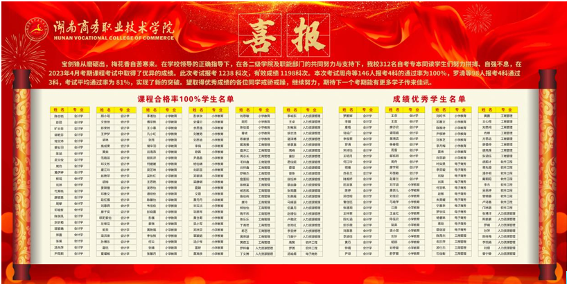鹏程万里今朝始,宏图大展正当时;书山勤磨剑锋利,学海苦游花香袭。优异的成绩离不开同学们自身的努力,也离不开学院领导及自考班主任老师们的谆谆教导。希望取得优异成绩的同学不骄不躁,再接再厉,也希望全体同学以先进为榜样,奋力拼搏,争取在未来取得更辉煌的成绩!