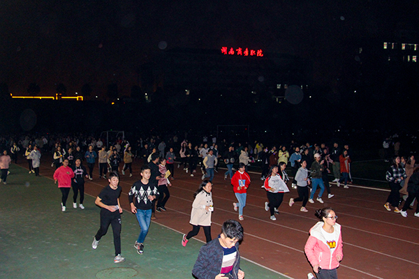 据悉,活动分三次进行,每晚8:50前同学们在田径场排队集合,领取荧光棒等装备,21:00整准时开始,总长为3公里。“荧光夜跑”活动一经推出,便在同学间引起强烈反响,众多学子分享线上活动信息,近5000余名学生参与其中。本次活动的成功举办,与各部门高度重视、密切配合、周密部署分不开,学工处做好活动前的宣传动员;体育课部的老师进行现场指挥,并讲解夜跑相关知识及注意事项;保卫处负责周密的安保措施,医务室医生全程在场守护。(文/邓玉梅 刘钰)