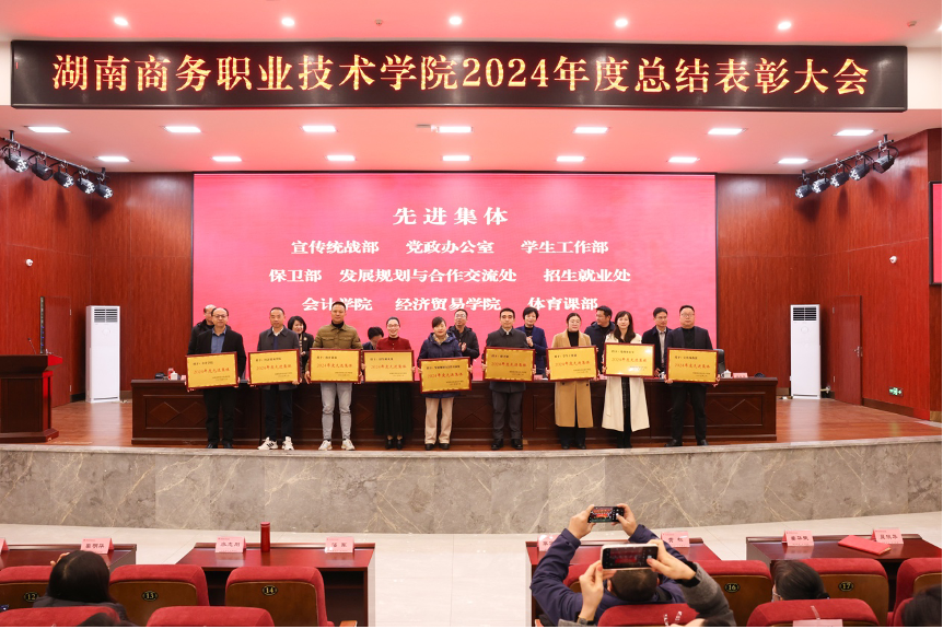 2月21日,湖南商务职业技术学院新学期开学会议暨2024年度总结表彰大会举行,9个先进集体、16名记功人员,5名优秀教研室主任,112名先进个人获表彰。全体院领导、教职员工参加大会,会议由党委副书记廖志刚主持。