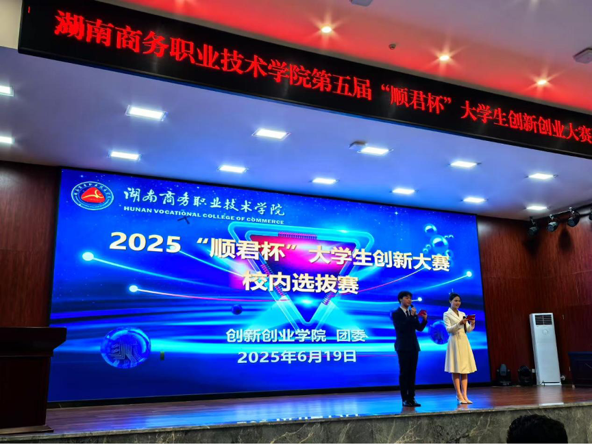 2025年6月19日晚,湖南商务职业技术学院第五届“顺君杯”大学生创新大赛校内选拔赛在崇理楼报告厅举行。本次大赛特邀湖南顺君商业管理有限公司总经理文志达一行担任颁奖嘉宾,学院党委委员、副院长禹明华、各二级学院副书记、各项目团队指导老师和参赛成员、创新创业学院全体工作人员以及团委全体工作人员等300余人齐聚现场,共同见证这一创新创业盛会。