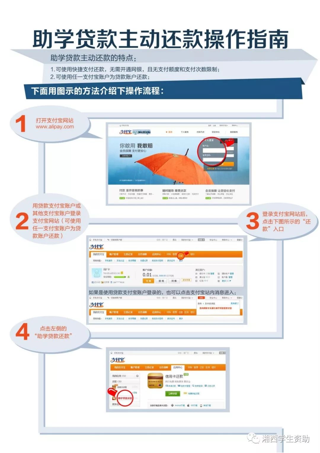2、提前还款:每年除11月外每月都可进行还款操作。每月1-15号(含),学生在在线服务系统提交提前还款申请,申请成功后利息算到当月月底,当月20日前将款项充入还款支付宝账户即可等待系统自动扣款,完成提前还款操作(支付宝也支持主动还款,登陆账号成功后可采取主动还款功能,将所需还款款项主动进行划扣)。如提前还款申请是在每月16日至月底这段时间提交的,申请成功后利息算到下月月底,可以通过POS机刷卡以及支付宝主动还款操作,也可以将款项存在支付宝账上等着下月21号系统批扣,下月无需再做提前还款申请。提前还款的申请各资助中心老师也可在业务系统以及POS机进行操作。提前还款当月有效,错过有效扣款期还款失败的,需要下个月再次提交申请,提前还款失败不会对学生征信产生任何影响。此类还款针对合同并未到期且有还款意愿的所有贷款学生。