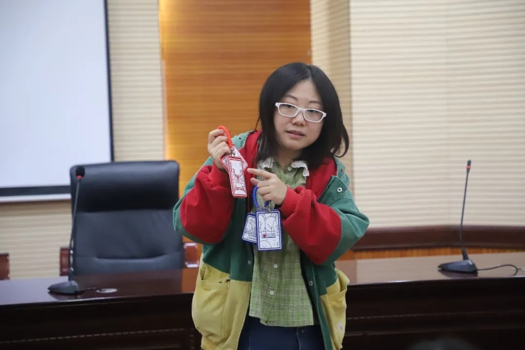 湖南财政经济学院知行画社徐晶老师上台进行知行画社创作分享。徐晶老师讲述了创办知行画社目地、创作灵感,并向我们展示他们设计的优秀作品,一件件定制的学生卡套、校戒、帽子等文创作品赢得学员们一致叫好。