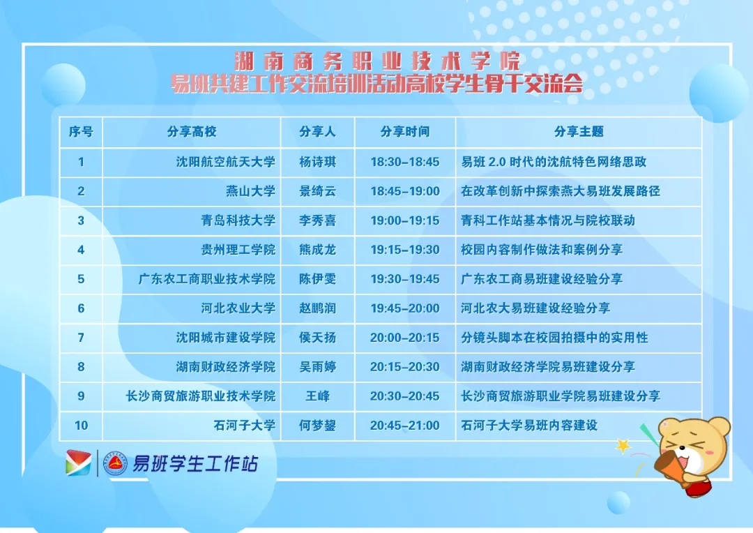 此次交流中,沈航易班学生骨干杨诗琪分享了他们打造一个具有航空特色和精神内涵的易班平台,通过线上线下联动,精心打造校园文化精品项目,例疫情时期为不能返校的毕业学子,打造云端祝福话离别、毕业照“校长为你留C位”暖心毕业系列活动等,燕山大学易班学生骨干景绮云介绍到燕山易班已经融入燕山学子的大学生活,“有困难,找燕小燕”深入每个燕山学子的心里等等,每一所高校的精彩分享都引来现场的阵阵掌声,学员们还在中途不禁竖起大拇指点赞。
