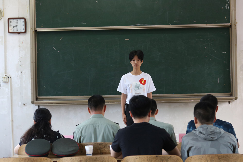 面试环节在上午8:30正式开始,每名应试者按抽签的先后顺序先进行简短的自我介绍,然后在3分30秒之内对自己从A、B、C、D四个题本中抽取的2个问题进行回答。面试题的内容涉及考察应试者的思想政治觉悟、道德素养、组织纪律性、组织协调能力、语言表达能力、突发事件处置能力等各方面的素质。大部分同学在面试过程中,落落大方,从容不迫,大胆地阐述自己的观点和处置突发事件的思路。
