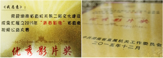 2015年12月 中共省直工委:省直机关第二届文化建设成果汇展之2015“青春影像”湖南省直微视频公益大赛“优秀影片奖”。