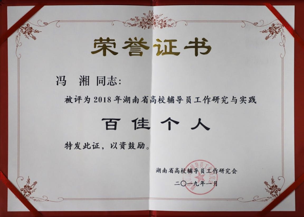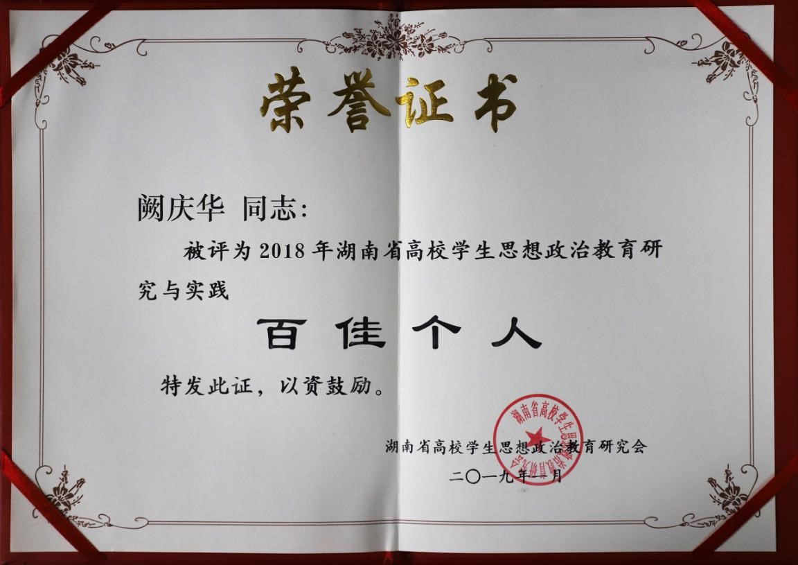 近日,从湖南省高校辅导员工作研究会得知,经湖南省高校学生思想政治教育研究会、湖南省辅导员工作研究会考核评审,我校荣获2018年湖南省高校辅导员工作研究与实践先进单位,冯湘荣获“湖南省高校辅导员工作研究与实践百佳个人”;阙庆华荣获“湖南省高校学生思想政治教育研究与实践百佳个人”。