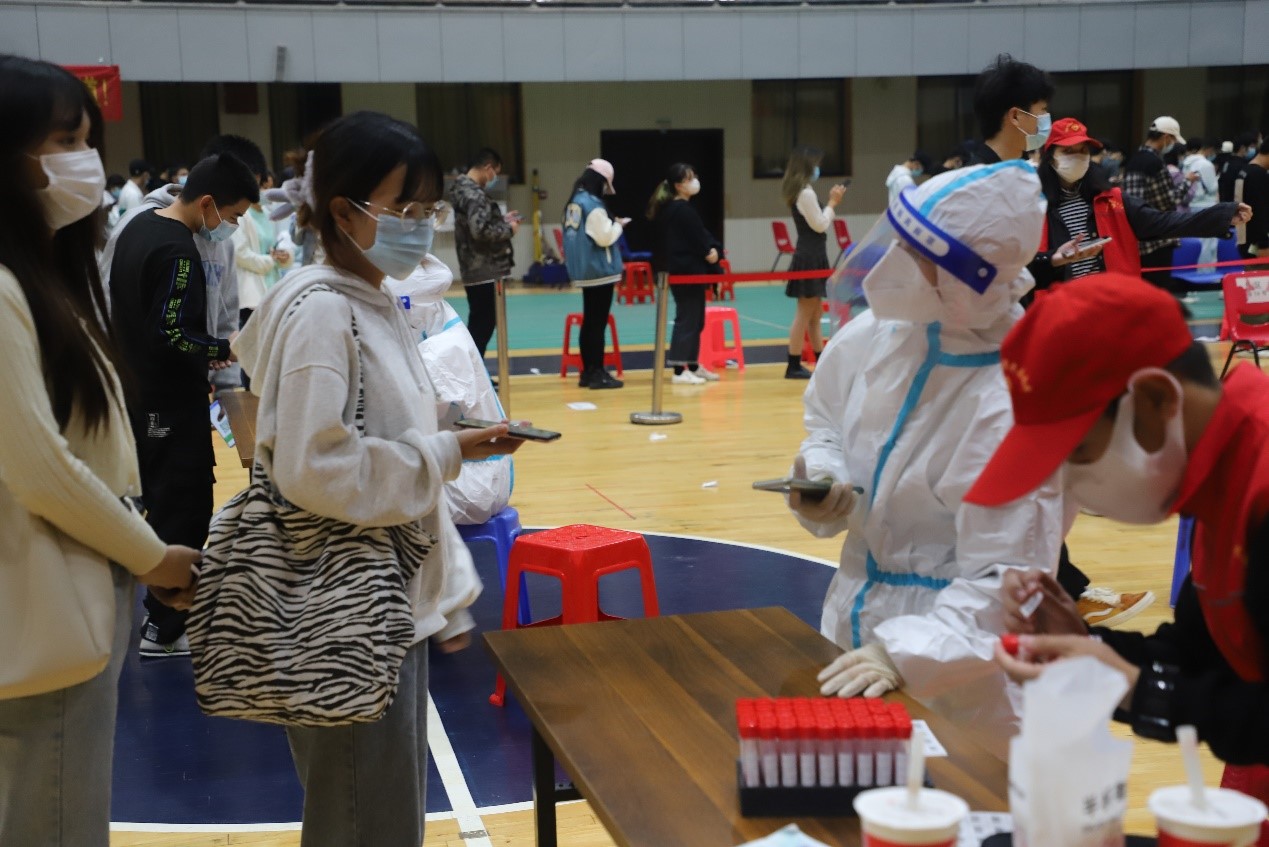 师生均佩戴口罩,在体育馆外有秩序的排队等候做核酸检测。体育馆内还播放着新冠肺炎的自我防护知识。