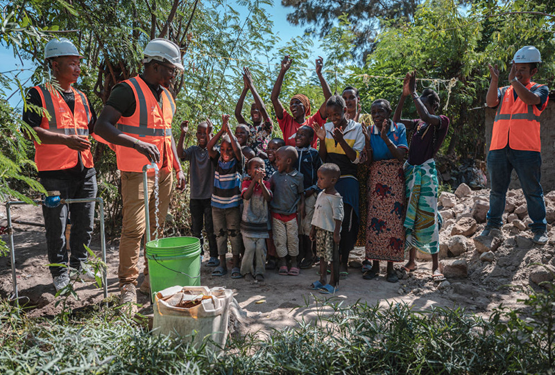 6月13日,在坦桑尼亚姆万扎省米松圭,凯尔文(左二)与同事接通水管后赢得当地居民鼓掌欢呼。(新华社记者 王冠森/摄)