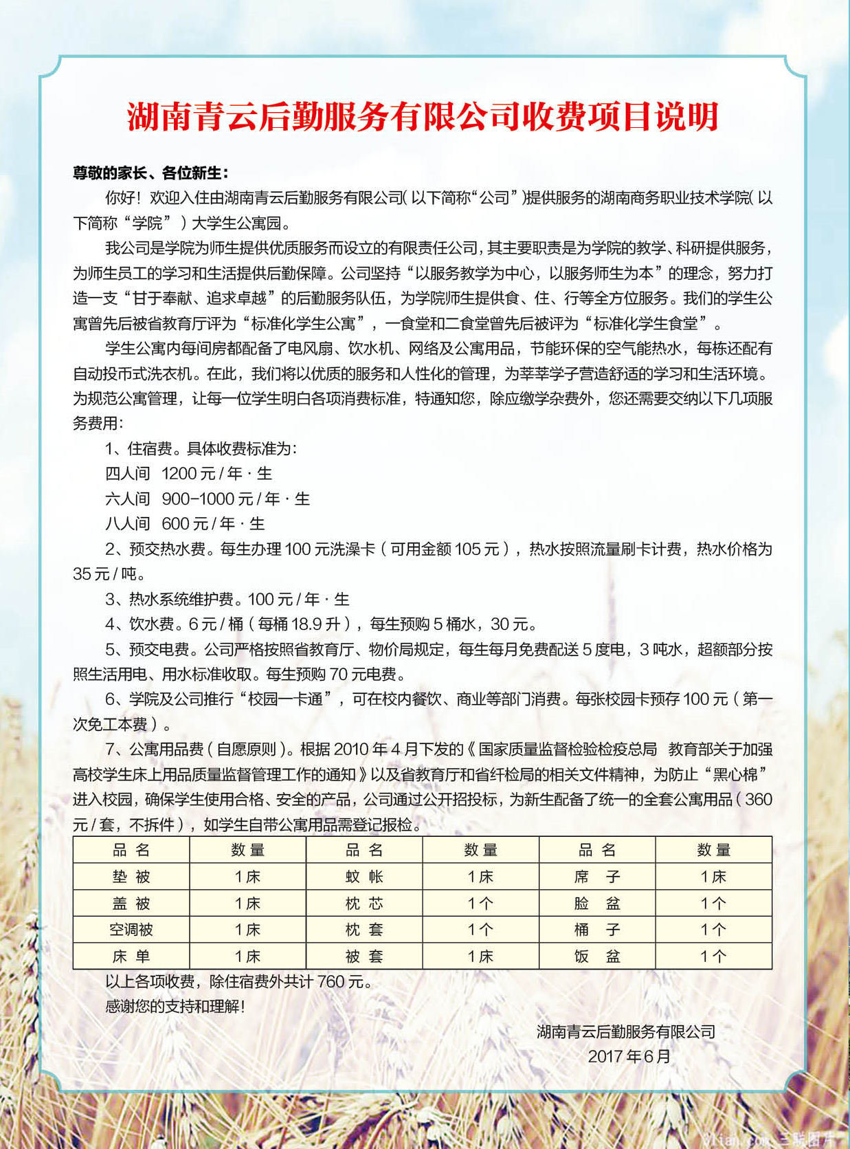 湖南青云后勤服务有限公司收费项目说明