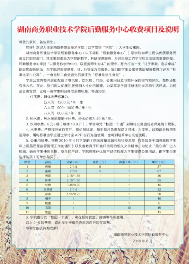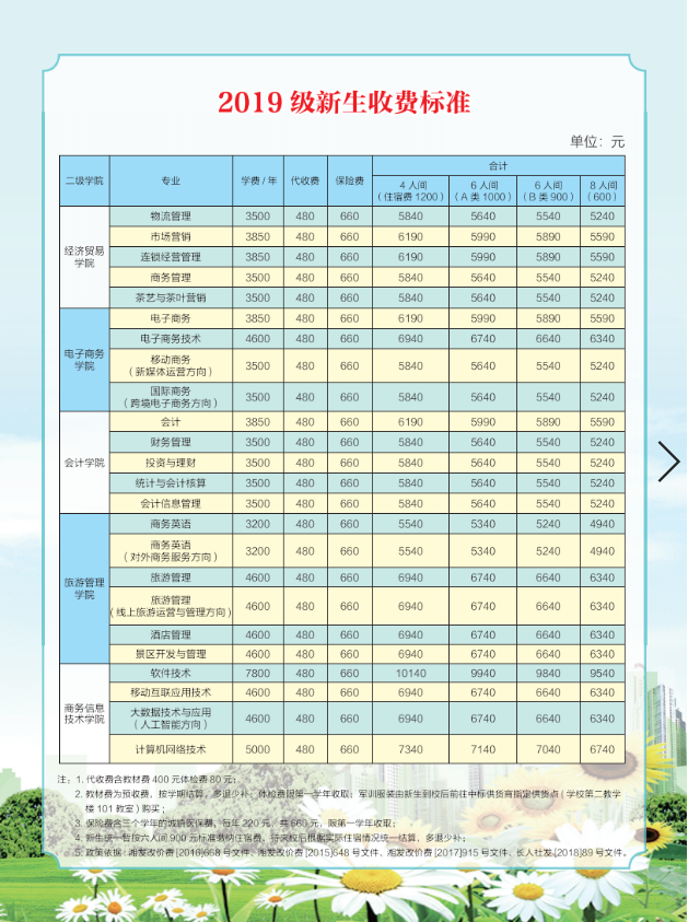2019年新生收费标准