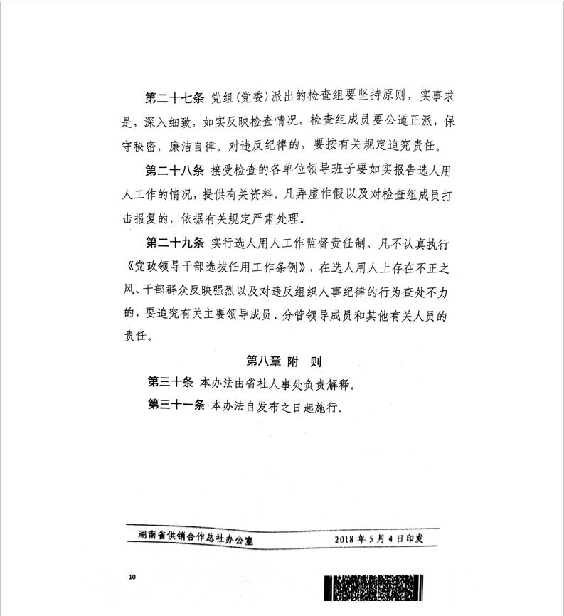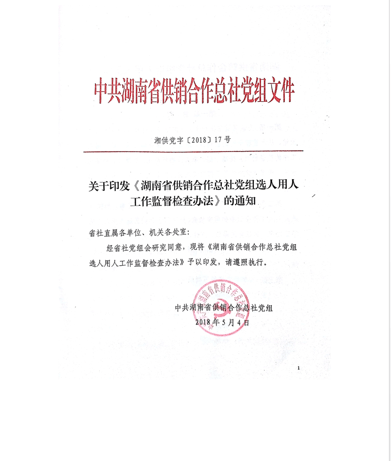 关于印发《湖南省供销合作总社党组选人用人工作监督检查办法》的通知